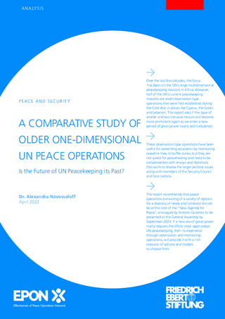 Is the future of UN peacekeeping its past? / Dr. Alexandra Novosseloff. - Nicosia : Friedrich-Ebert-Stiftung, Office Cyprus, April 2022. - 34 Seiten = 3 MB, PDF-File. - (Analysis). - (Peace and security)Electronic ed.: Nicosia : FES, 2022ISBN 978-9963-2021-5-7