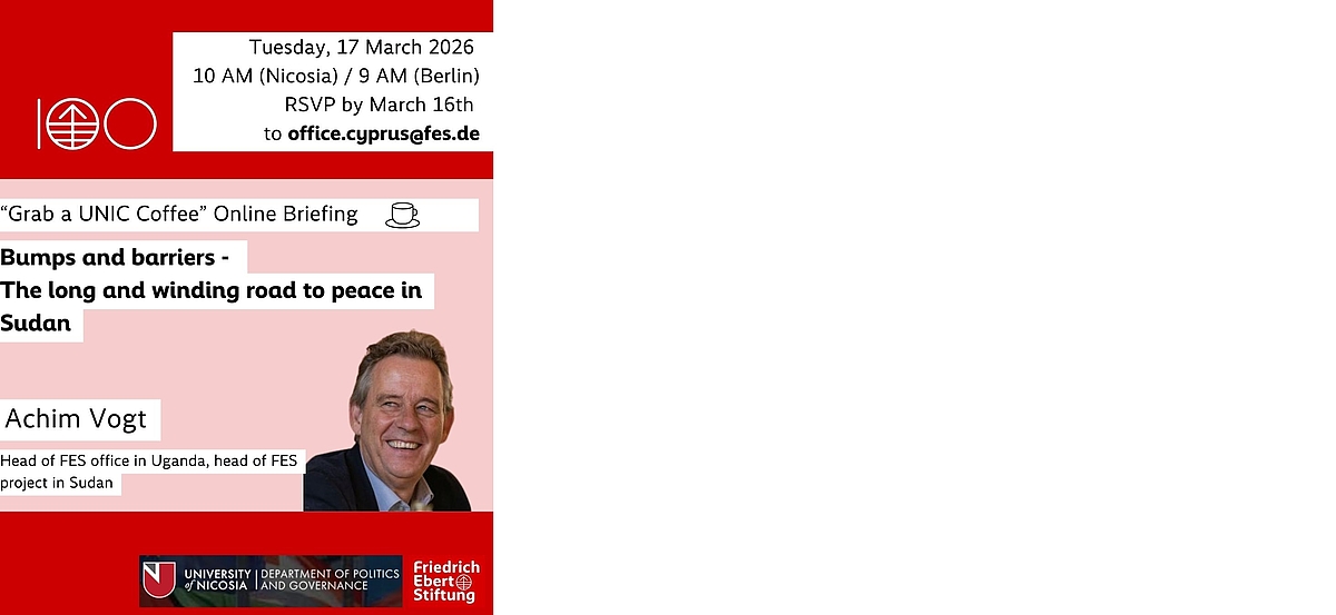 The latest edition of “Grab a UNIC Coffee”, hosted by the Department of Politics and Governance of the University of Nicosia and the Friedrich-Ebert-Stiftung Cyprus Office was all about Sudan. The online Briefing “Bumps and Barriers: The Long and Winding Road to Peace in Sudan” was held by Speaker Achim Vogt, who is head of FES office in Uganda and of the FES project in Sudan.